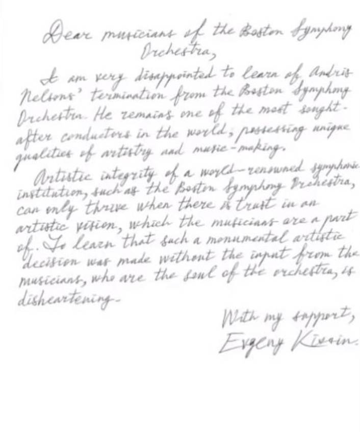 In a handwritten letter addressed to the musicians of the orchestra, Kissin writes that he is “very disappointed” by the decision, describing Nelsons as “one of the most sought-after conductors in the world” and praising his “unique qualities of artistry and music-making.”
