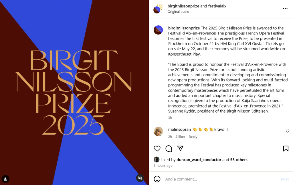 According to the Birgit Nilsson Foundation, the Festival was selected “for its exceptional artistic achievement and its commitment to creating and commissioning new opera productions.” The award acknowledges Aix’s bold programming, international reach, and dedication to both tradition and innovation.