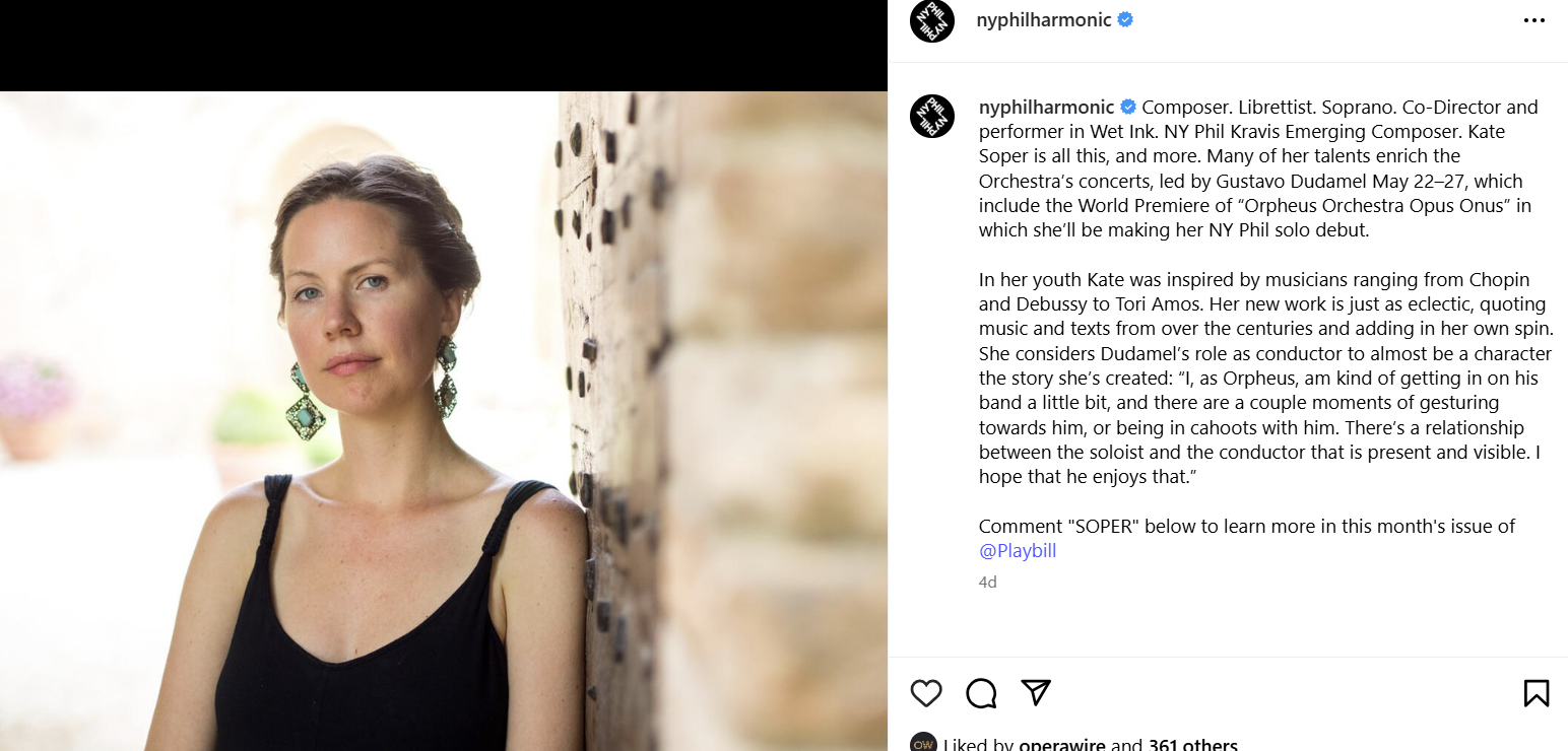 Composer and soprano Kate Soper returns to center stage this week as the New York Philharmonic unveils the world premiere of her latest work, Orpheus Orchestra Opus Onus, a mythologically inspired piece that explores the figure of Orpheus. Soper will perform the soprano solo herself in the premiere, conducted by Gustavo Dudamel, the Philharmonic’s Music and Artistic Director Designate.