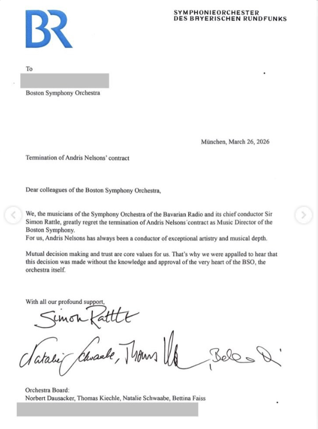 Musicians of the Symphony Orchestra of the Bavarian Radio, together with their chief conductor Sir Simon Rattle, have expressed support for Andris Nelsons following the decision to end his tenure at the Boston Symphony Orchestra in 2027.